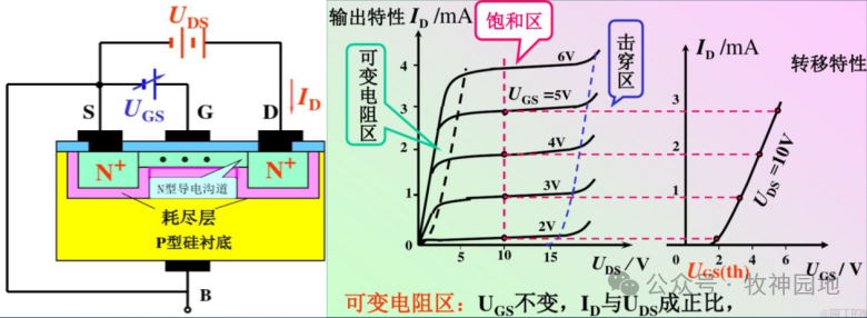 1,增强型NMOS管 增强型NMOS管是N+P+N的结构,中间为P型衬底,所以沟道在默认情况下并没有“自由电子”可供通电流,同时P型衬底与D和S的交界处会形成两个PN结—“空间电荷区”(耗尽层)。 接下来我们看下在不同电压条件下的状态: 1. 当Vgs=0V时,DS之间由两个二极管背靠背串联,所以在DS之间加电压不会形成电流,处于断开状态。 2. 当0<Vgs<Vth时,G极指向衬底方向的电场使得空穴向下移动,“自由电子”向上移动(漂移运动),在衬底上表面形成耗尽层,但还是没有电流。 3. 当Vgs>Vth时,G极下衬底形成N型电导沟,当DS之间加电压可产生电流。 4. 当Vgs越大,N沟道越宽(“自由电子”浓度越高),DS之间的等效电阻Rds越小,在相同Vds电压作用下,漏极电流越大。