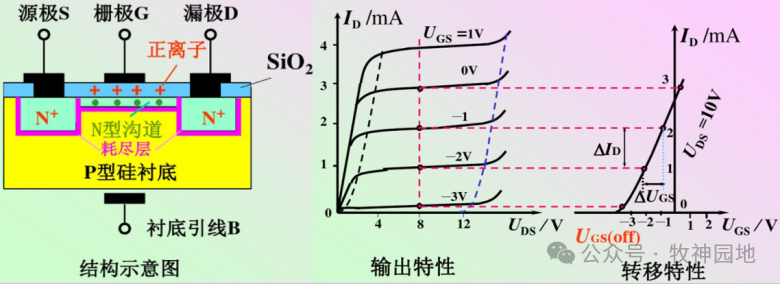2,耗尽型NMOS管 耗尽型NMOS管,制造时在二氧化硅绝缘层中掺入大量正离子(带正电),此时沟道在默认条件下(Vgs无外加正向电压)通过本身自带正电场“吸附”了一些“自由电子”,并形成导电通道。此时DS之间的电流通道已背打通。 所以耗尽型NMOS相对增强型NMOS在V-I曲线上,呈现电压偏移特性,需要在Vgs加上负电压才能关闭MOS管。 1. 当Vgs=0V时,就存在导电沟道,如果在DS极之间加电压Vds,就会有Id电流。 2. 当Vgs>0V时,沟道增宽,ID电流进一步增加。 3. 当Vgs<0V时,沟道变窄,加ID电流减少。