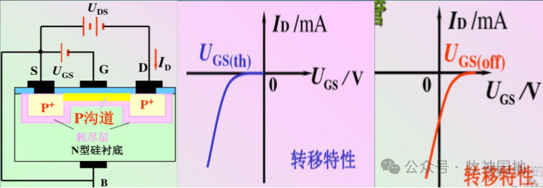 3,PMOS管 P沟道MOS管结构与N沟道MOS管互为对偶关系,此时需要G极带负电才能“吸附”带正电的“空穴”。所以使用PMOS管时Vgs、Vds的极性与N沟道刚好相反,即Vgs要加负电压。 1. P沟道增强型MOS管Vgs(th)为负值,当Vgs< Vgs(th)时导通。 2. P沟道耗尽型MOS管Vgs(off)为正,Vgs< Vgs(off)时导通。