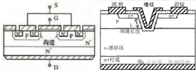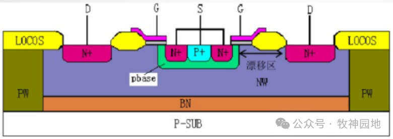 那么,大家可能又会产生一个疑惑:P型半导体只有 “空穴”,而几乎无“自由电子”,为什么N型衬底在默认情况的沟道通道上有“自由电子”时不能导通,反而需要将“空穴”吸附到沟道通道才能导通呢? 好,我们再强调一次:“空穴”可以等价看成 “正自由电子”,它可以移动,但质量略大于“自由电子”(迁移率较低)。具体请回顾之前介绍PN结章节内容。 4,功率MOS管 功率MOS管从字面上理解是为大功率、高耐压应用所设计;在结构上功率MOSFET分为: LDMOS和VDMOS; 所谓LDMOS是指:横向双扩散金属氧化物半导体场效应管;如下图所示。